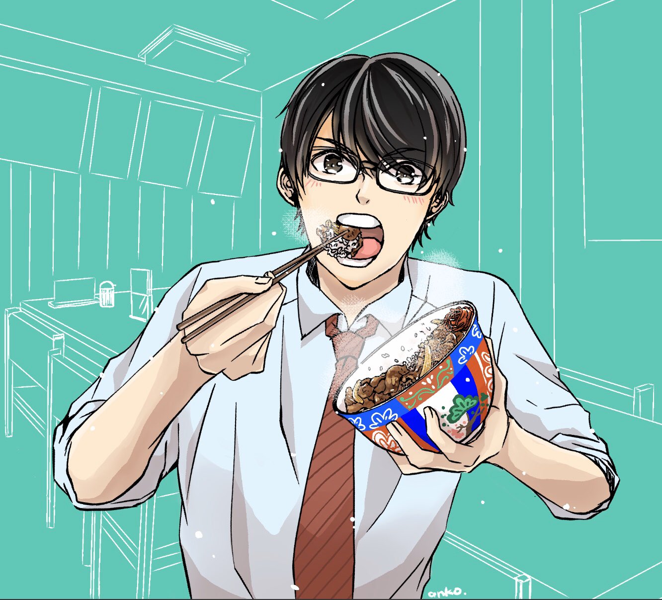 藤井あん子 創作イラスト モグモグ男子 3 牛丼 いつも素敵なコメントを下さる七海さん 7miayami からのリクエストで 牛丼にしてみました 今回はメガネ モグモグ男子です 気持ち良く食べるイケメンは誰だって恋に落ちてしまいそう
